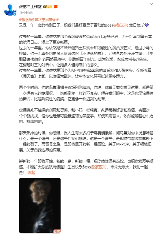 工作室的长文里,藏着张艺兴过去一年 “开挂式” 的成长轨迹。作为演员,他在《不说话的爱》中化身沉默却深情的小马,用细腻的肢体语言与眼神,将无声的情感传递到银幕内外,让无数观众为之共情;更在音乐话剧《受到召唤・敦煌》中完成 “一人分饰两角” 的突破,既是 2035 年追寻敦煌文化的实习生张燃,也是百年前毅然归国守护莫高窟的常书鸿先生,通过田沁鑫导演打造的时空对话舞台,让 “莫高精神” 以更年轻的方式被看见。而作为深耕 M-POP 的音乐制作人,他带着全新专辑《闹天宫》再度突破,将美猴王的传奇故事、中国传统乐器与国际化编曲融合,让中华文化符号借旋律飘向更远的地方。